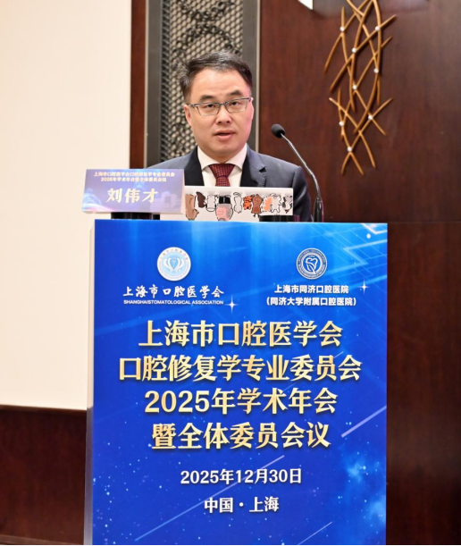 会议由专委会主任委员刘伟才教授主持。他汇报总结2025年工作并作2026年工作计划展望,总结和感谢了过去一年全委会成员的充实工作和艰辛努力,同时表达了新的一年推动上海市口腔修复学科综合诊疗水平更进一步的决心。