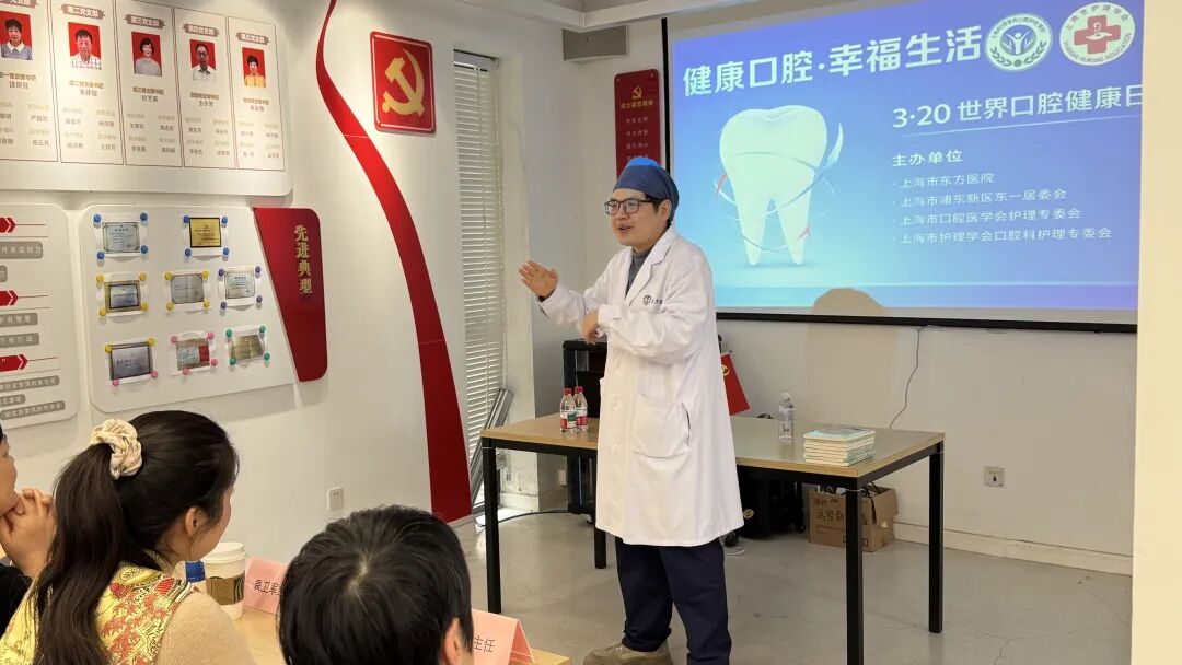 紧接着,上海市东方医院口腔科护士施耀程开展了以题为《健康由“齿”开始》的科普演讲。他从牙齿的结构与功能入手,深入浅出地讲解了龋齿、牙周炎的成因与危害,并结合临床案例强调了“病从口入”的新观念——口腔细菌可能诱发心血管疾病甚至阿尔茨海默病等全身性疾病。现场演示了正确的刷牙方法、牙线及牙间隙刷的使用技巧,并对活动假牙与种植牙的优缺点进行了客观比较。他最后向居民普及了口腔健康的五项自测指标,倡导“预防为主、定期检查”的口腔护理理念,鼓励大家用心维护牙齿,实现“健康牙齿伴终身”。